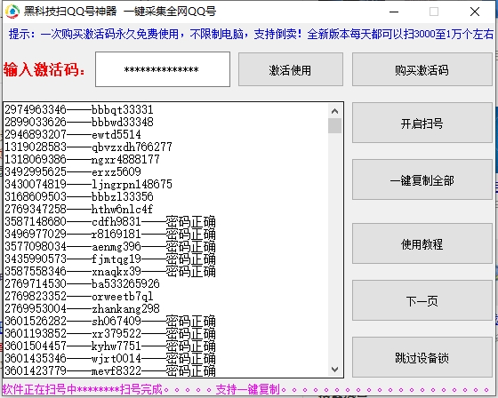 黑科技扫QQ号神器可以免费获取全网QQ账号,扫遍全网当天号,并且帮你批量检测QQ密码是否正确,批量验证QQ小号是否可用,全新版本每天都可以扫3000至1万个左右,是一款小巧但是功能强大的黑科技软件,对于有这方面需求的用户来说既方便又划算,一次购买激活码就可以永久免费使用哦!