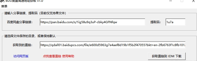BDD度盘高速地址获取是一款能帮助用户快速获取百度云盘下载的文件的下载直链的软件,利用这款软件能够让用户更好的配合IDM下载器进行文件的高速下载,省去等待的时间,快速下载想要的东西,非常便捷,有需要的小伙伴可以下载使用~