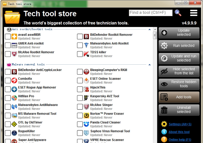 Tech Tool Store包含了500多个技术人员教学工具,全部是免费提供给用户使用的,您只需要简单的点击几下就可以快速完成配置、更新、组织和运行所需的工具,由于工具比较多,有一些暂时用不到的可以加在隐藏列表中,非常方便,而且软件不需要任何安装,完全可移植,可以将它移动到您的工具包的大容量存储设备。