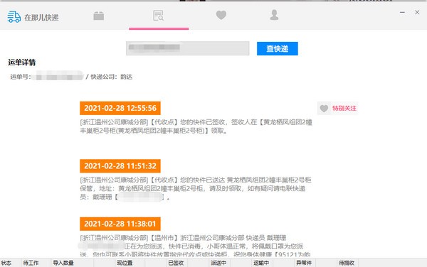 与网页和APP上面查询的物流单号并没有什么太大的区别,唯一较大的区别就是,可以将该单号进行“特别关注”,进行保存起来,下次可以进行一键追踪,或者是查看物流状态信息!