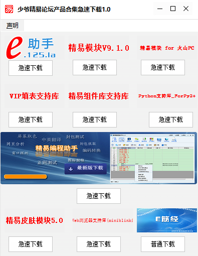 精易论坛产品下载工具是专为精易论坛的用户们打造的下载工具,通过这款软件用户可以轻松下载精易论坛上面的各种产品模块,方便进行后续的使用和操作,更加方便快捷地开发应用程序,软件界面简洁直观,用户只需点击一键下载即可获取到所需的内容,功能十分强大!