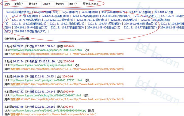 在搜索区域,第一个输入“ /index.html ”,第二个输入蜘蛛名称“Baiduspider”,或蜘蛛留下的网址。