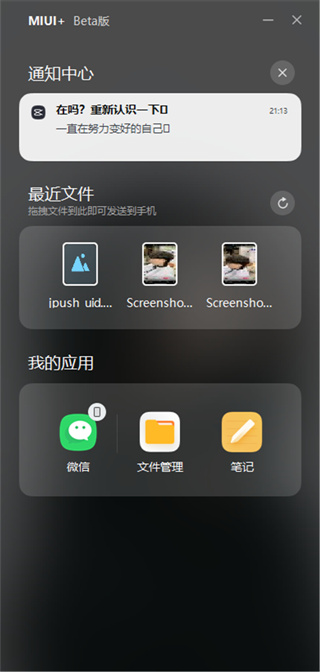 4、MIUI+在电脑的右边会有一个主场景布局,主场景布局相当于手机的告诉中间,外面有告诉中间、比来文件和我的运用,运用中第一个是手机比来翻开或是主场景布局对应的运用,然后另有文件办理和条记是常驻的,这一场景布局可以往边上挪一下悬浮埋没,鼠标移到屏幕最右侧会主动弹出这个场景布局。