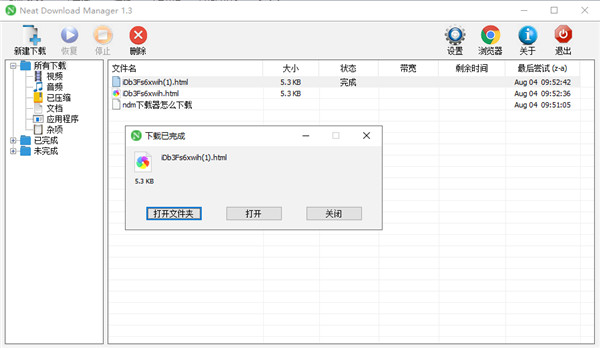 5、运用ndm下载器下载完成后,便可看到下方截图的弹窗提醒,点击 Open Folder 操控键位便可翻开文件下载目次,点击 Open 操控键位便可翻开文件,Close 用来封闭弹窗提醒。